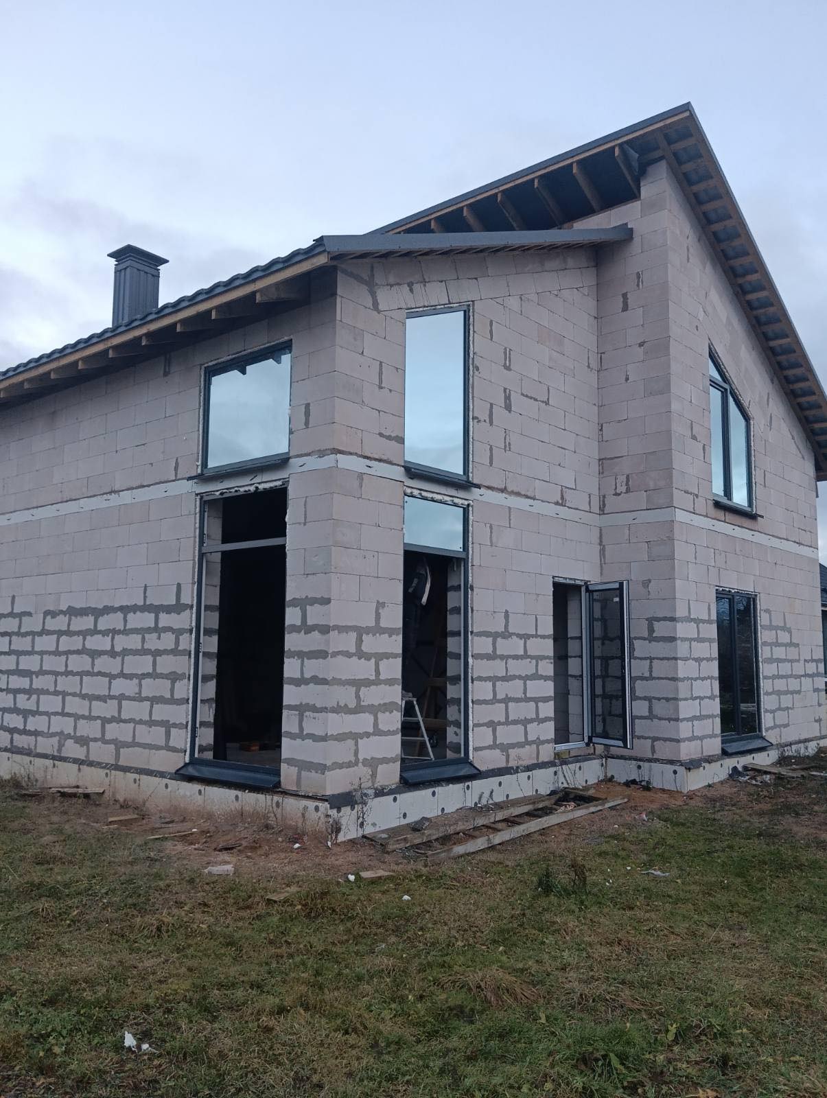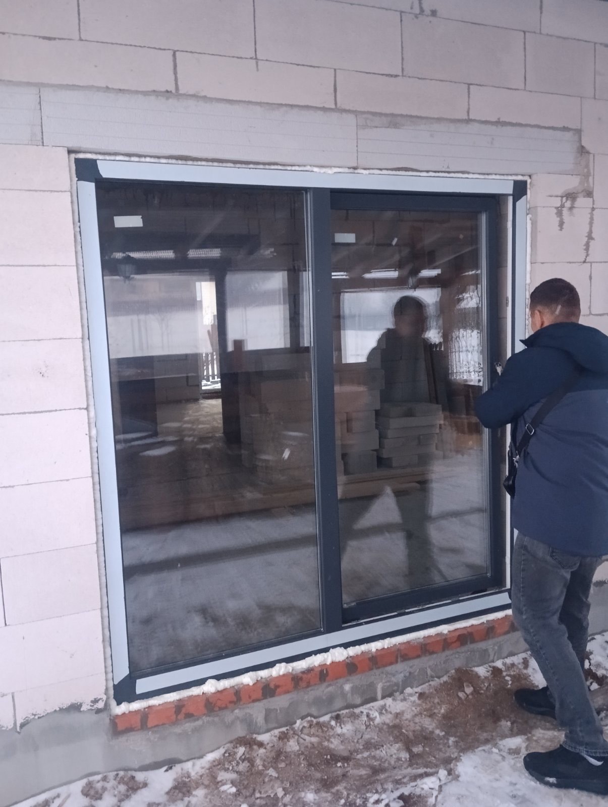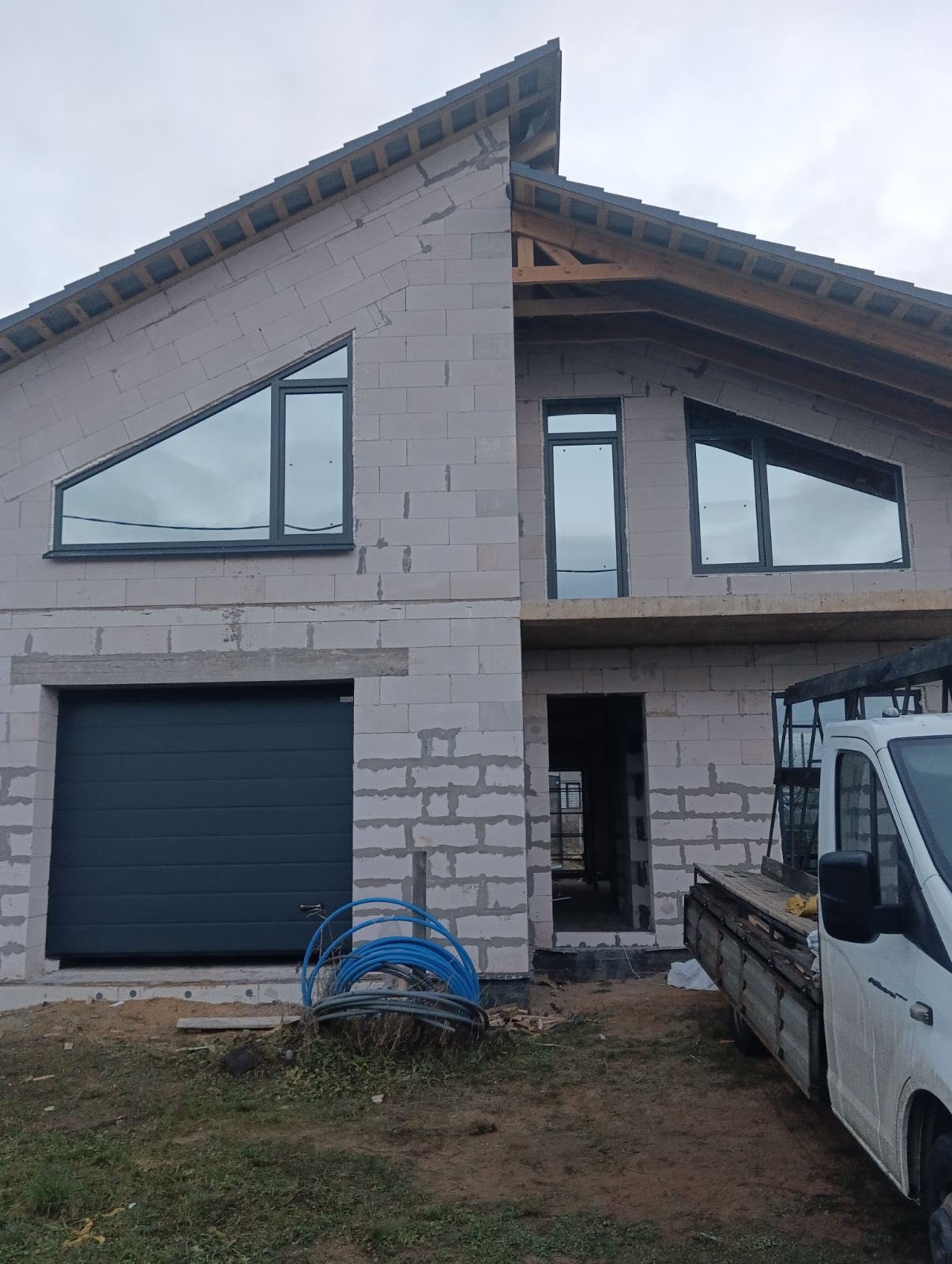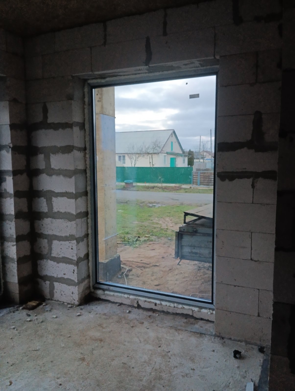 Объект — одэтажный частный дом на этапе фасадных работ (ветрогидрозащита и обрешётка под отделку). Задача — установить тёплые окна и выход на террасу с корректным «слоёным» узлом примыкания под будущий фасад.